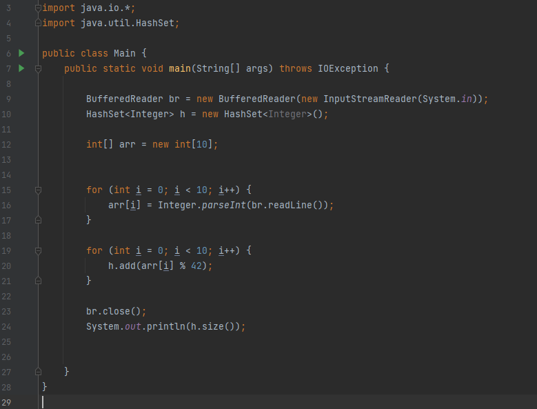 ๊ทธ๋ ๊ธฐ์ Integerํ์ ์ Hashset h ๊ฐ์ฒด๋ฅผ ์์ฑํด์ฃผ๊ณ ,