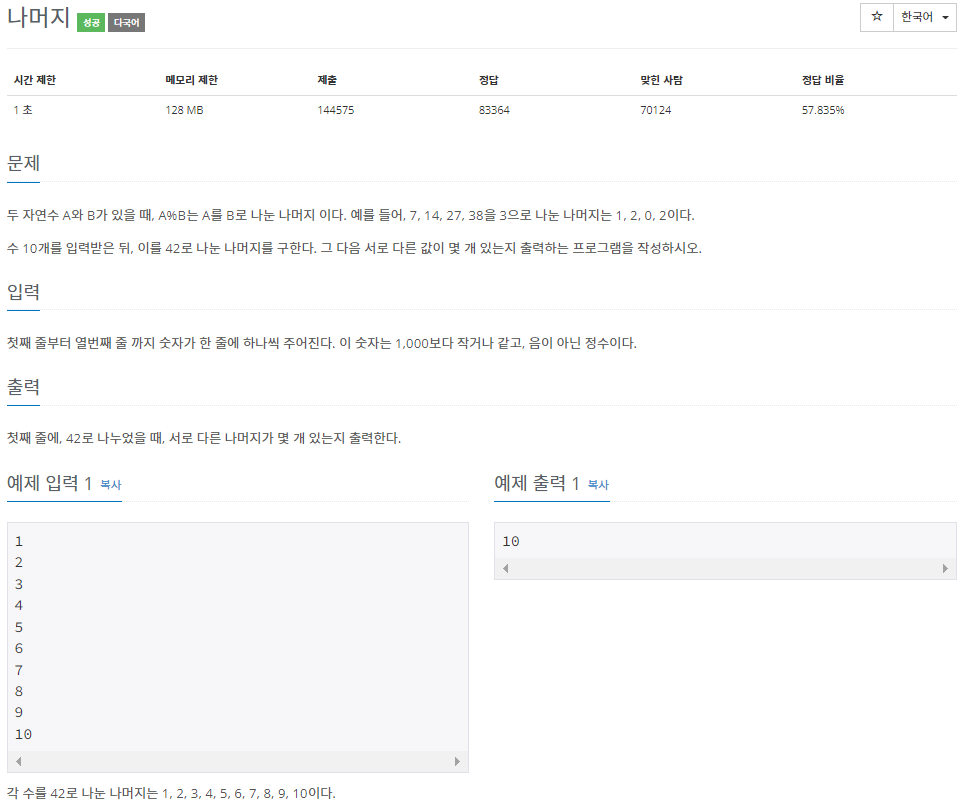 ๊ฐ ์๋ฅผ 42๋ก ๋๋ ๋๋จธ์ง๋ 39, 40, 41, 0, 1, 2, 40, 41, 0, 1์ด๋ค. ์๋ก ๋ค๋ฅธ ๊ฐ์ 6๊ฐ๊ฐ ์๋ค.