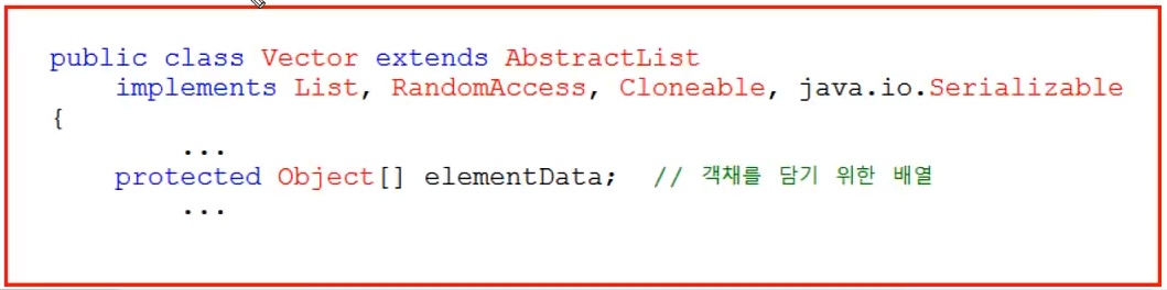 Vectorํด๋์ค์ ์์ค ์ฝ๋๋ฅผ ๋ณด๋ฉด ๊ฐ์ฒด๋ฅผ ๋ด๊ธฐ ์ํ ๋ฐฐ์ด ํ์ ์ผ๋ก Object[]๋ฅผ ์ฌ์ฉํ๋ค.