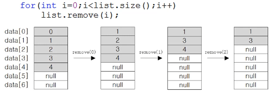๋ฐ๋ณต๋ฌธ for๋ฌธ์ ํตํด ArrayList์ ๊ฐ์ฒด๋ฅผ ๋ชจ๋ ์ญ์ ํ๋ค๋ฉด int i = list.size()๋ก ํด์ผ ํ๋ค.