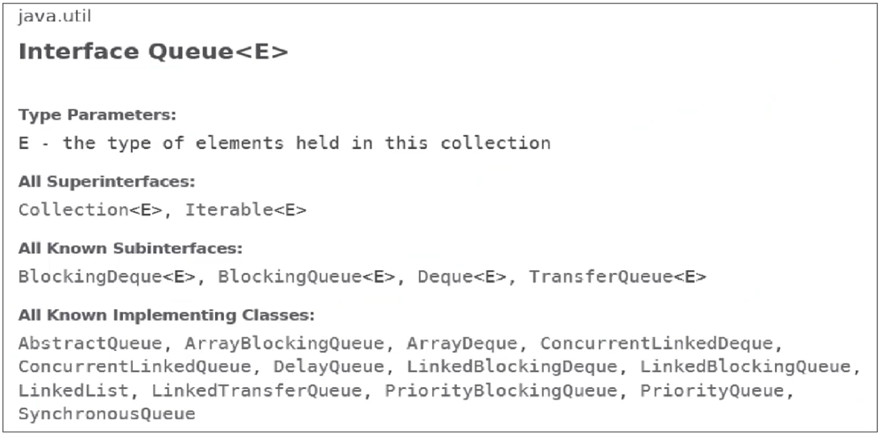 ๊ทธ๋ ๊ฒ Java API์ Queue๋ฅผ ์ดํด๋ณด๋ฉด ๋ค์๊ณผ ๊ฐ๋ค.