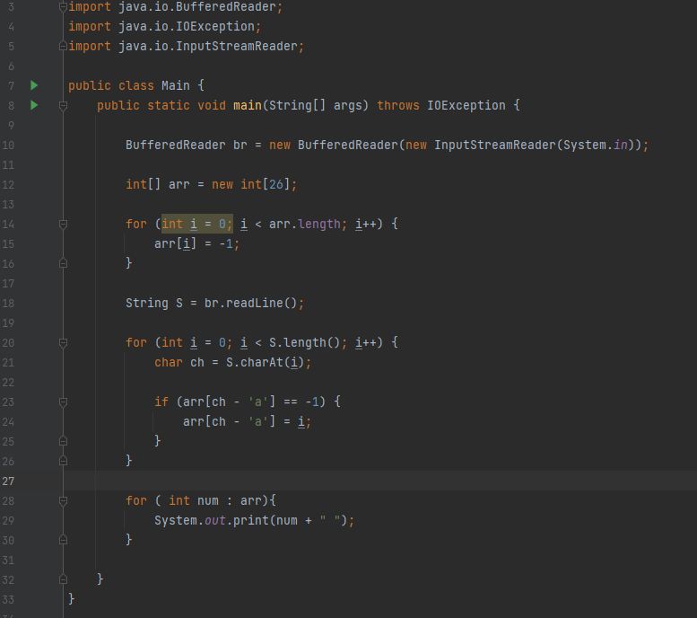 ๊ฐ๊ฐ์ ์ํ๋ฒณ์ ๋ํด์, a๊ฐ ์ฒ์ ๋ฑ์ฅํ๋ ์์น, b๊ฐ ์ฒ์ ๋ฑ์ฅํ๋ ์์น, ... z๊ฐ ์ฒ์ ๋ฑ์ฅํ๋ ์์น๋ฅผ ๊ณต๋ฐฑ์ผ๋ก ๊ตฌ๋ถํด์ ์ถ๋ ฅํ๋ค. ๋ง์ฝ, ์ด๋ค ์ํ๋ฒณ์ด ๋จ์ด์ ํฌํจ๋์ด ์์ง ์๋ค๋ฉด -1์ ์ถ