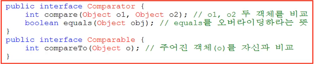 - ๊ฐ์ฒด ์ ๋ ฌ์ ํ์ํ ๋ฉ์๋(์ ๋ ฌ ๊ธฐ์ค ์ ๊ณต)๋ฅผ ์ ์ํ ์ธํฐํ์ด์ค
