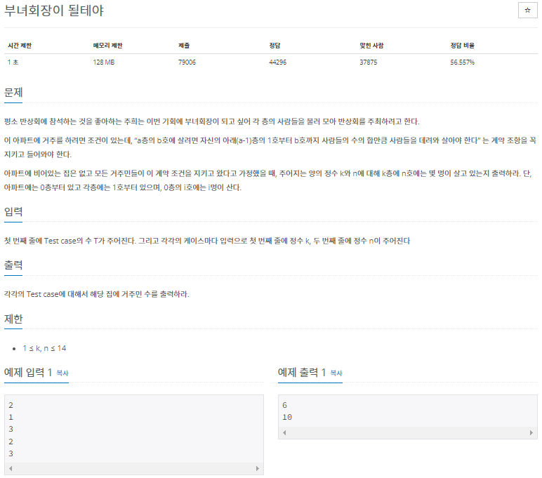 https://www.acmicpc.net/problem/2775 2775๋ฒ: ๋ถ๋ ํ์ฅ์ด ๋ ํ ์ผ ์ฒซ ๋ฒ์งธ ์ค์ Test case์ ์ T๊ฐ ์ฃผ์ด์ง๋ค. ๊ทธ๋ฆฌ๊ณ ๊ฐ๊ฐ์ ์ผ์ด์ค๋ง๋ค ์ ๋ ฅ์ผ๋ก ์ฒซ ๋ฒ์งธ ์ค์ ์ ์ k, ๋ ๋ฒ์งธ ์ค์ ์ ์ n์ด ์ฃผ์ด์ง๋ค. (1