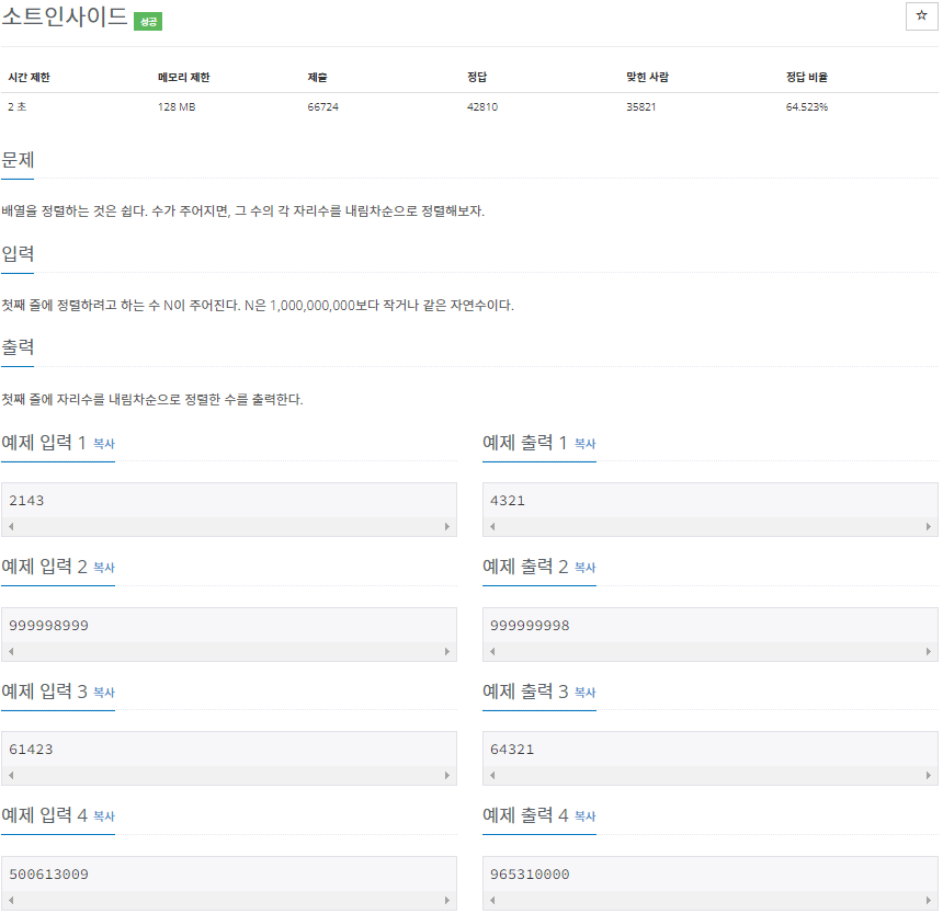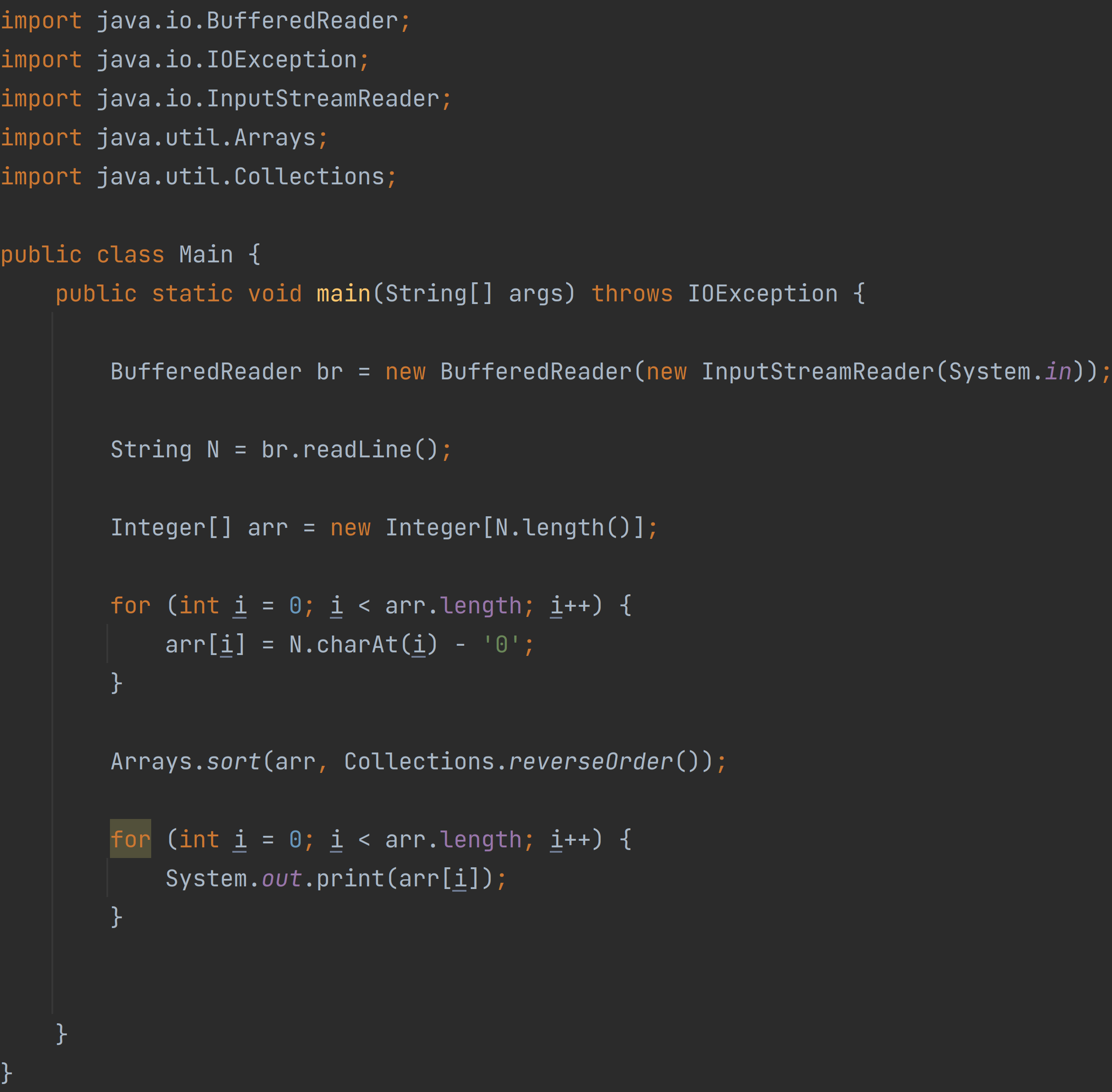 ์ฒซ์งธ ์ค์ ์ ๋ ฌํ๋ ค๊ณ ํ๋ ์ N์ด ์ฃผ์ด์ง๋ค. N์ 1,000,000,000๋ณด๋ค ์๊ฑฐ๋ ๊ฐ์ ์์ฐ์์ด๋ค.