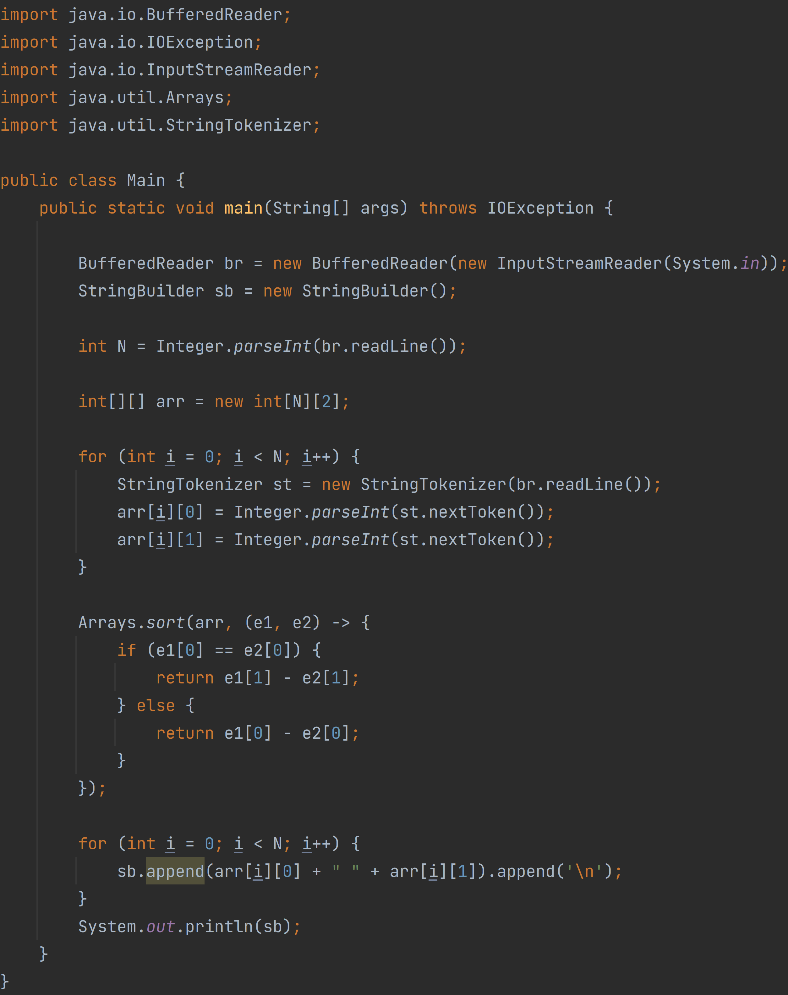 sb.append(arr[i][0] + " " + arr[i][1]).append('\n');