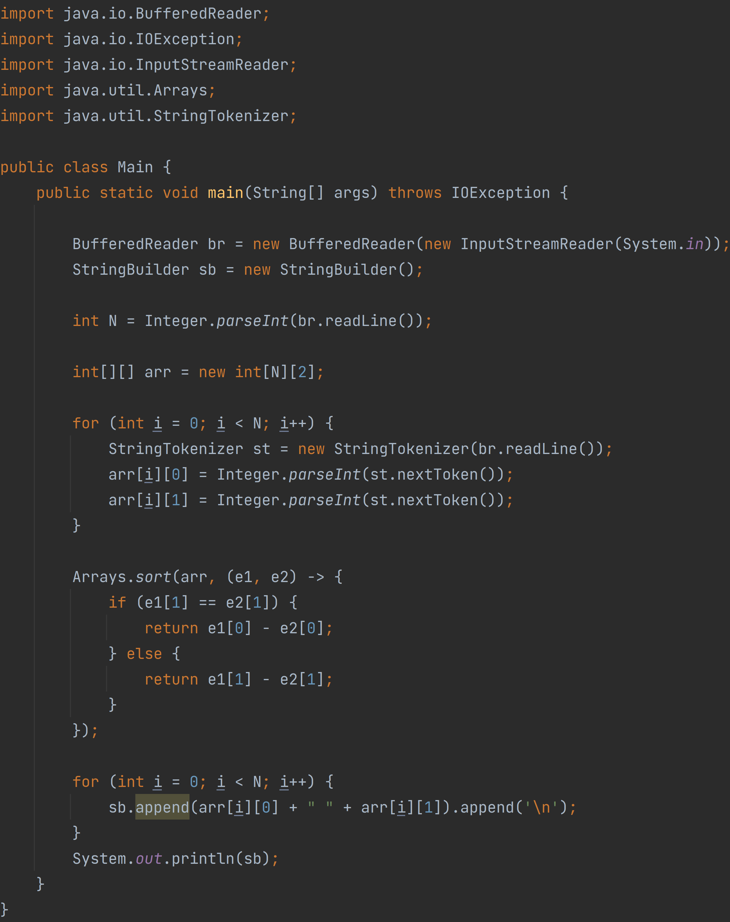 11650๋ฒ: ์ขํ ์ ๋ ฌํ๊ธฐ ์ฒซ์งธ ์ค์ ์ ์ ๊ฐ์ N (1 ≤ N ≤ 100,000)์ด ์ฃผ์ด์ง๋ค. ๋์งธ ์ค๋ถํฐ N๊ฐ์ ์ค์๋ i๋ฒ์ ์ ์์น xi์ yi๊ฐ ์ฃผ์ด์ง๋ค. (-100,000 ≤ xi, yi ≤ 100,000) ์ขํ๋ ํญ์ ์ ์์ด๊ณ , ์์น๊ฐ ๊ฐ