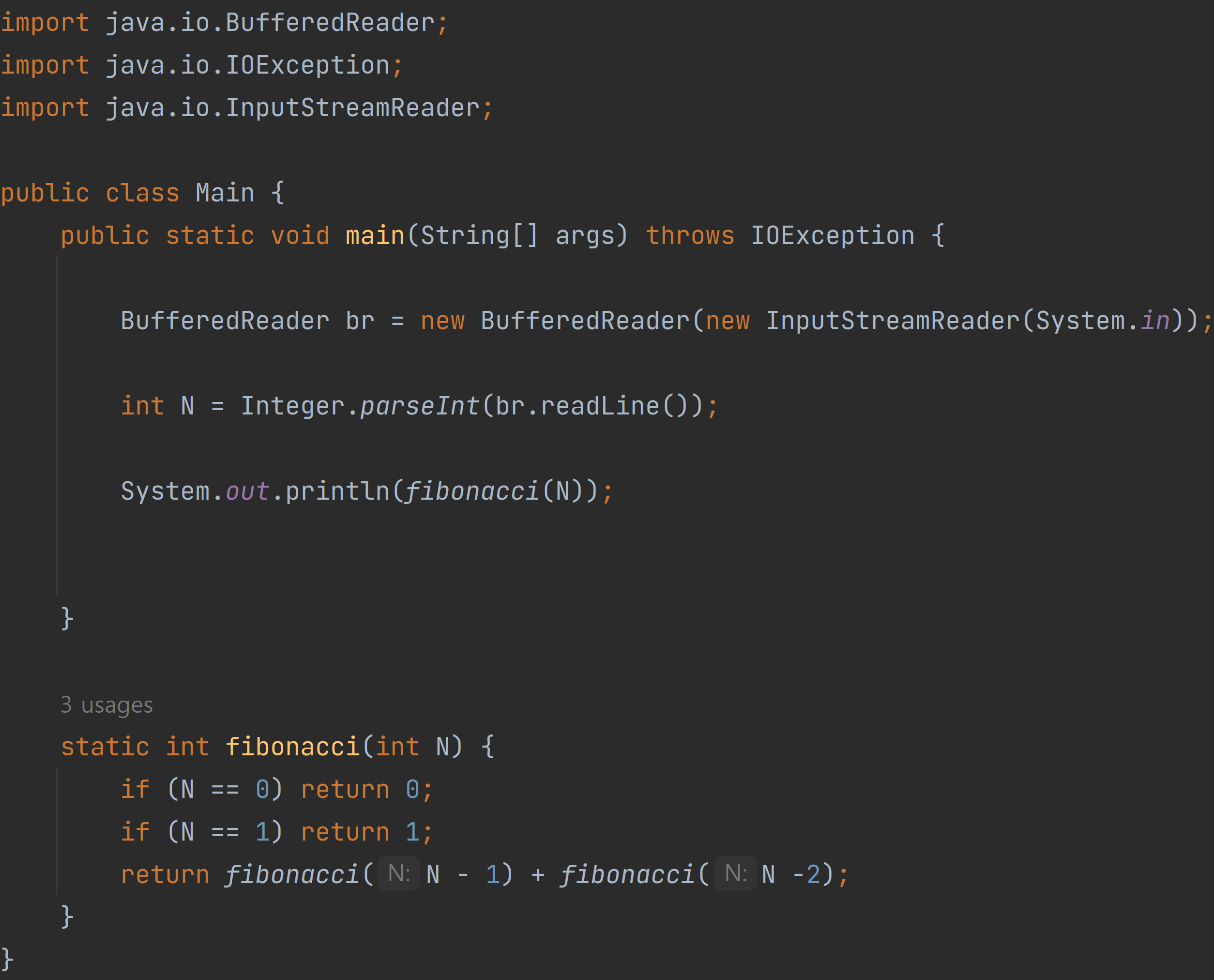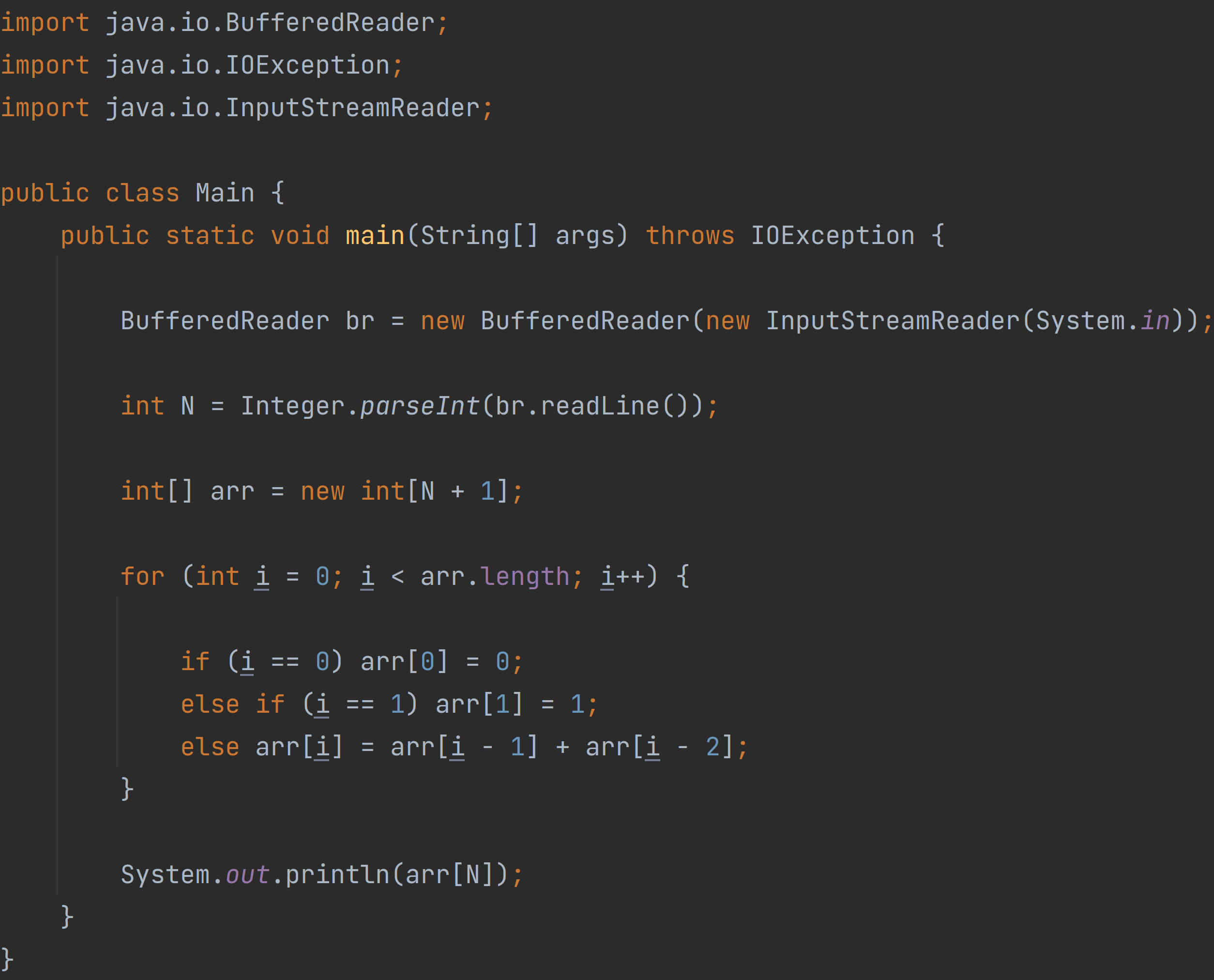 ํผ๋ณด๋์น ์๋ 0๊ณผ 1๋ก ์์ํ๋ค. 0๋ฒ์งธ ํผ๋ณด๋์น ์๋ 0์ด๊ณ , 1๋ฒ์งธ ํผ๋ณด๋์น ์๋ 1์ด๋ค. ๊ทธ ๋ค์ 2๋ฒ์งธ ๋ถํฐ๋ ๋ฐ๋ก ์ ๋ ํผ๋ณด๋์น ์์ ํฉ์ด ๋๋ค. ์ด๋ฅผ ์์ผ๋ก ์จ๋ณด๋ฉด Fn = Fn-1 + Fn-2 (n ≥ 2)๊ฐ