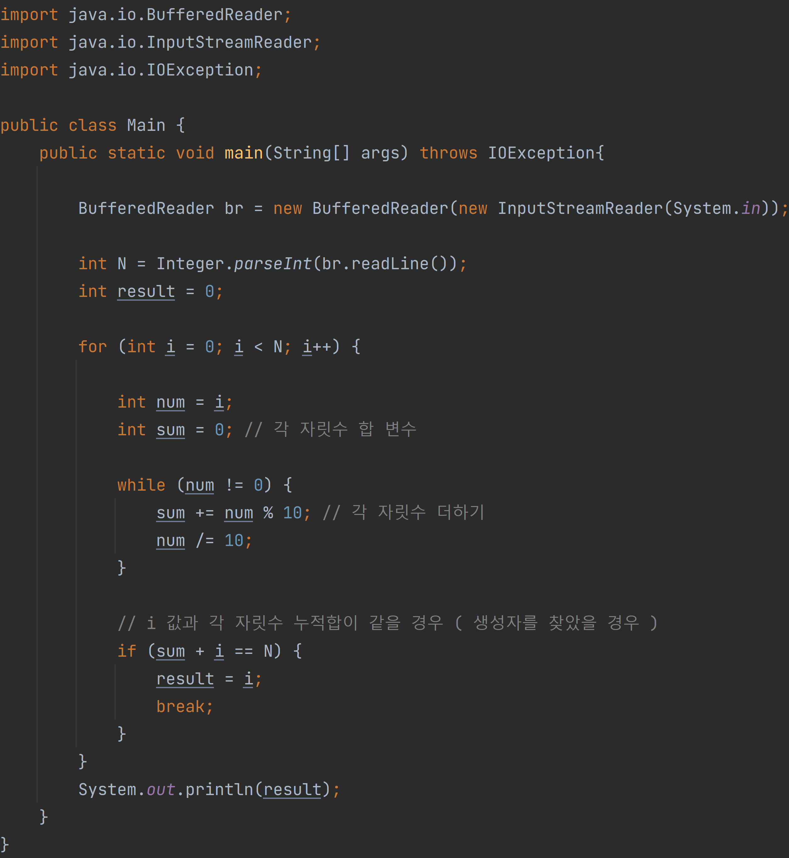 ์ด๋ค ์์ฐ์ N์ด ์์ ๋, ๊ทธ ์์ฐ์ N์ ๋ถํดํฉ์ N๊ณผ N์ ์ด๋ฃจ๋ ๊ฐ ์๋ฆฌ์์ ํฉ์ ์๋ฏธํ๋ค. ์ด๋ค ์์ฐ์ M์ ๋ถํดํฉ์ด N์ธ ๊ฒฝ์ฐ, M์ N์ ์์ฑ์๋ผ ํ๋ค. ์๋ฅผ ๋ค์ด, 245์ ๋ถํดํฉ์ 256(=245+2+4+5)์ด