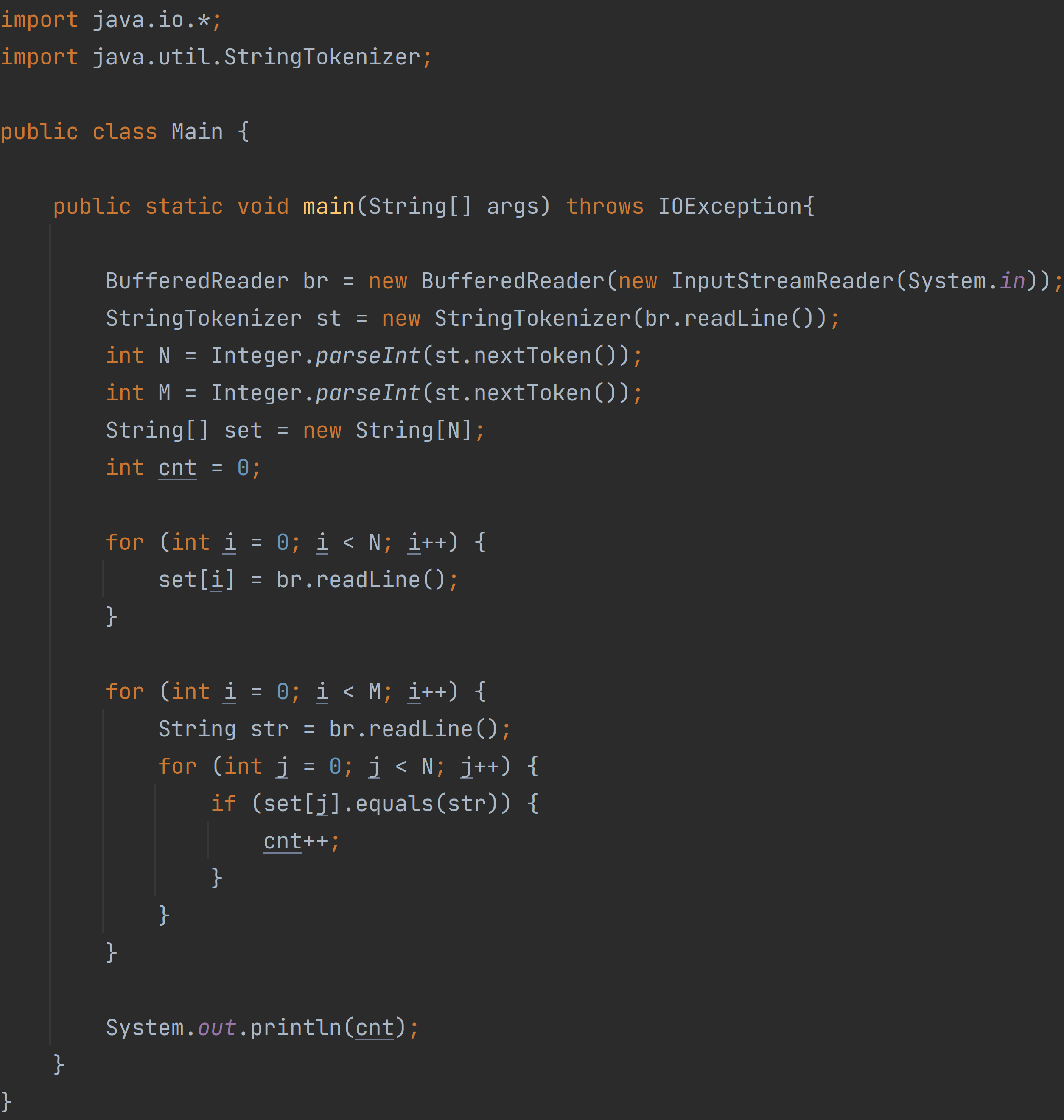 ์ฒซ์งธ ์ค์ ๋ฌธ์์ด์ ๊ฐ์ N๊ณผ M (1 ≤ N ≤ 10,000, 1 ≤ M ≤ 10,000)์ด ์ฃผ์ด์ง๋ค. ๋ค์ N๊ฐ์ ์ค์๋ ์งํฉ S์ ํฌํจ๋์ด ์๋ ๋ฌธ์์ด๋ค์ด ์ฃผ์ด์ง๋ค. ๋ค์ M๊ฐ์ ์ค์๋ ๊ฒ์ฌํด์ผ ํ๋ ๋ฌธ์์ด๋ค์ด ์ฃผ์ด