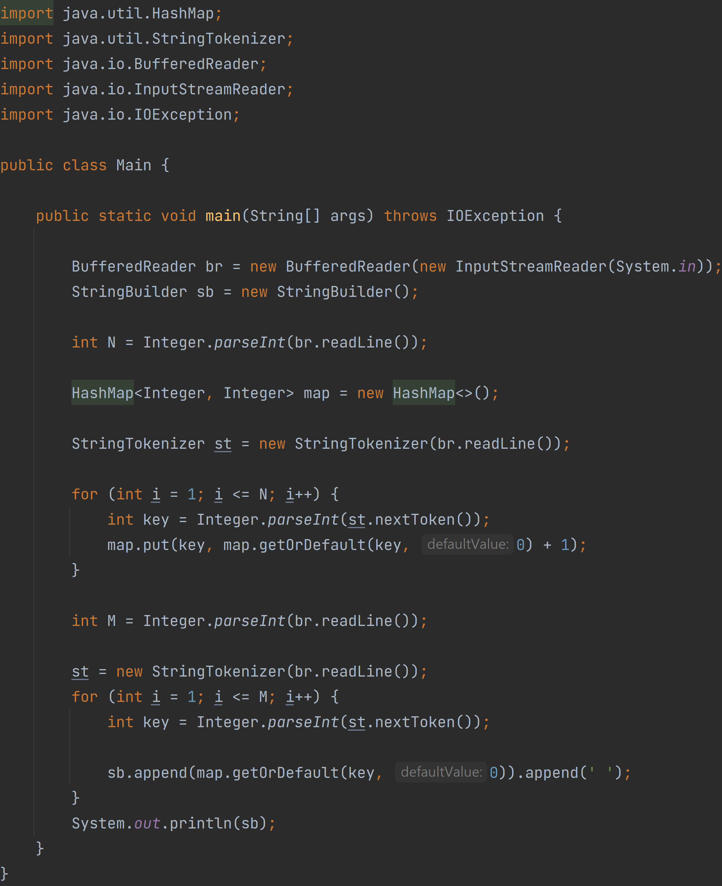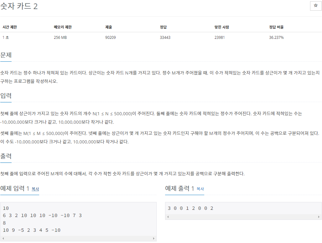 ์ฒซ์งธ ์ค์ ์๊ทผ์ด๊ฐ ๊ฐ์ง๊ณ ์๋ ์ซ์ ์นด๋์ ๊ฐ์ N(1 ≤ N ≤ 500,000)์ด ์ฃผ์ด์ง๋ค. ๋์งธ ์ค์๋ ์ซ์ ์นด๋์ ์ ํ์๋ ์ ์๊ฐ ์ฃผ์ด์ง๋ค. ์ซ์ ์นด๋์ ์ ํ์๋ ์๋ -10,000,000๋ณด๋ค ํฌ๊ฑฐ๋ ๊ฐ๊ณ , 10,