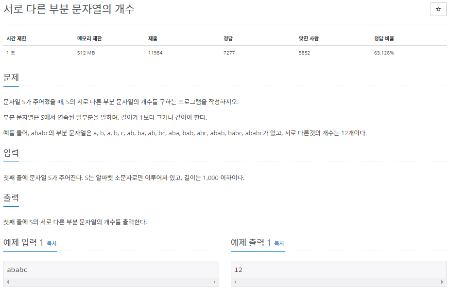 11478๋ฒ: ์๋ก ๋ค๋ฅธ ๋ถ๋ถ ๋ฌธ์์ด์ ๊ฐ์