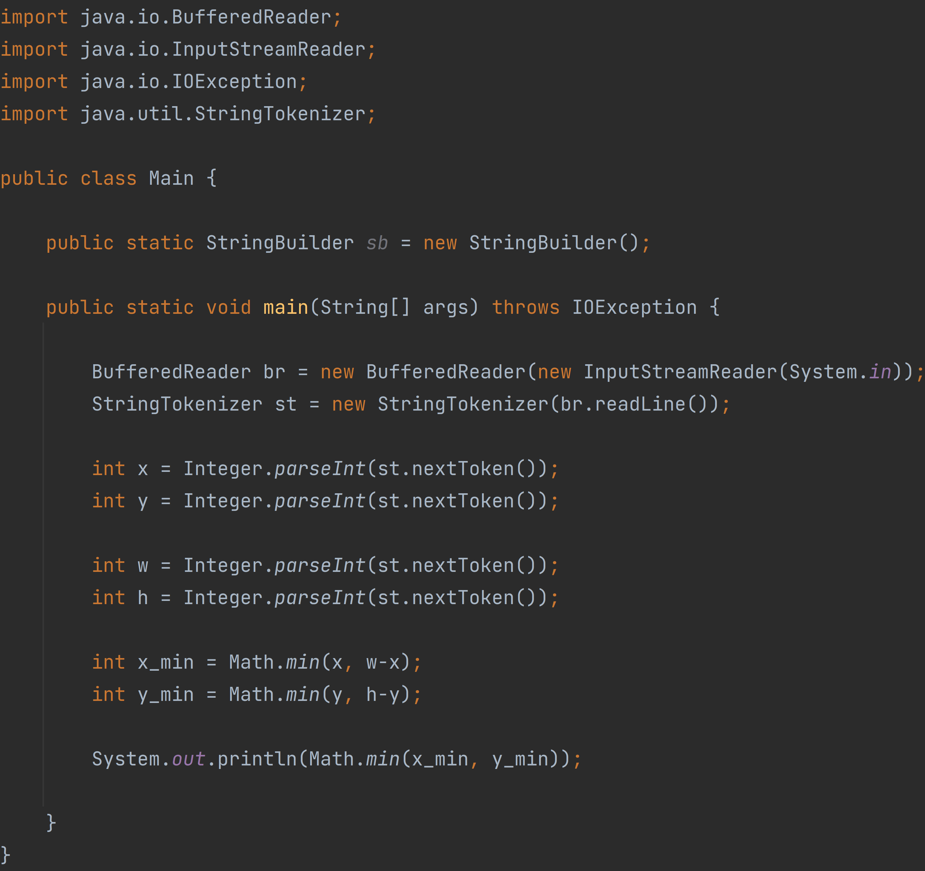 ํ์๋ ์ง๊ธ (x, y)์ ์๋ค. ์ง์ฌ๊ฐํ์ ๊ฐ ๋ณ์ด ์ขํ์ถ์ ํํํ๊ณ , ์ผ์ชฝ ์๋ ๊ผญ์ง์ ์ (0, 0), ์ค๋ฅธ์ชฝ ์ ๊ผญ์ง์ ์ (w, h)์ ์๋ค. ์ง์ฌ๊ฐํ์ ๊ฒฝ๊ณ์ ๊น์ง ๊ฐ๋ ๊ฑฐ๋ฆฌ์ ์ต์๊ฐ์ ๊ตฌํ๋ ํ๋ก๊ทธ๋จ