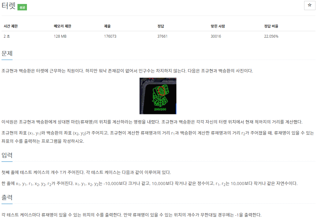 https://www.acmicpc.net/problem/1002 1002๋ฒ: ํฐ๋ ๊ฐ ํ ์คํธ ์ผ์ด์ค๋ง๋ค ๋ฅ์ฌ๋ช ์ด ์์ ์ ์๋ ์์น์ ์๋ฅผ ์ถ๋ ฅํ๋ค. ๋ง์ฝ ๋ฅ์ฌ๋ช ์ด ์์ ์ ์๋ ์์น์ ๊ฐ์๊ฐ ๋ฌดํ๋์ผ ๊ฒฝ์ฐ์๋ -1์ ์ถ๋ ฅํ๋ค. www.acm