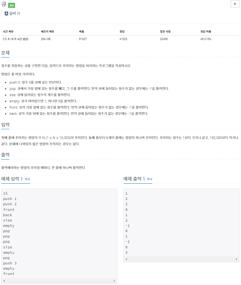 ์๋ ํ์ธ์~ ์ฝ๋ฉํ๋ ์ฝ์๋ชป ์ฝ๋ฉ์ธ์ ๋๋ค. https://www.acmicpc.net/problem/10845 10845๋ฒ: ํ ์ฒซ์งธ ์ค์ ์ฃผ์ด์ง๋ ๋ช ๋ น์ ์ N (1 ≤ N ≤ 10,000)์ด ์ฃผ์ด์ง๋ค. ๋์งธ ์ค๋ถํฐ N๊ฐ์ ์ค์๋ ๋ช ๋ น์ด ํ๋์ฉ ์ฃผ์ด