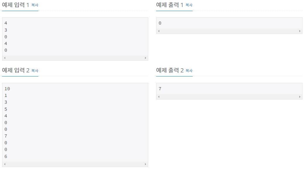 ์ฒซ ๋ฒ์งธ ์ค์ ์ ์ K๊ฐ ์ฃผ์ด์ง๋ค. (1 ≤ K ≤ 100,000) ์ดํ K๊ฐ์ ์ค์ ์ ์๊ฐ 1๊ฐ์ฉ ์ฃผ์ด์ง๋ค. ์ ์๋ 0์์ 1,000,000 ์ฌ์ด์ ๊ฐ์ ๊ฐ์ง๋ฉฐ, ์ ์๊ฐ "0" ์ผ ๊ฒฝ์ฐ์๋ ๊ฐ์ฅ ์ต๊ทผ์ ์ด ์๋ฅผ ์ง์ฐ๊ณ , ์๋ ๊ฒฝ