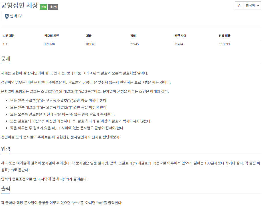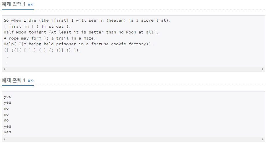 ํ๋ ๋๋ ์ฌ๋ฌ์ค์ ๊ฑธ์ณ์ ๋ฌธ์์ด์ด ์ฃผ์ด์ง๋ค. ๊ฐ ๋ฌธ์์ด์ ์๋ฌธ ์ํ๋ฒณ, ๊ณต๋ฐฑ, ์๊ดํธ("( )") ๋๊ดํธ("[ ]")๋ฑ์ผ๋ก ์ด๋ฃจ์ด์ ธ ์์ผ๋ฉฐ, ๊ธธ์ด๋ 100๊ธ์๋ณด๋ค ์๊ฑฐ๋ ๊ฐ๋ค. ๊ฐ ์ค์ ๋ง์นจํ(".")๋ก ๋๋๋ค
