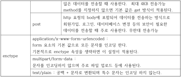 method=“์ ์ก๋ฐฉ์” enctype=“์๋ฒ๋ก ๋ณด๋ผ ํผ ๋ฐ์ดํฐ์ ์ธ์ฝ๋ฉ ํ์”>