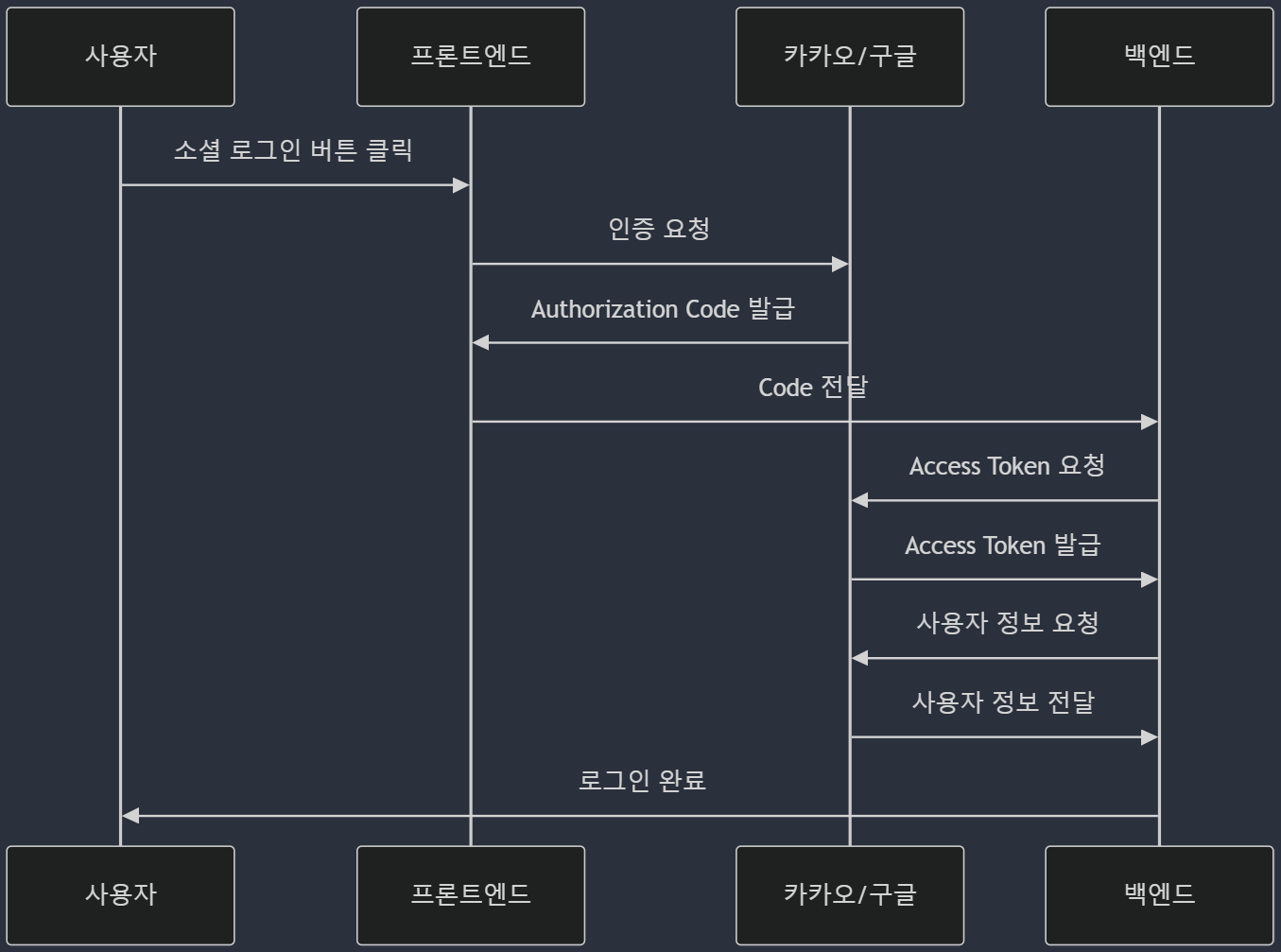 - ์ฌ์ฉ์๊ฐ ์นด์นด์ค ๋๋ ๊ตฌ๊ธ ๊ณ์ ์ ์ด์ฉํด ๋ก๊ทธ์ธ ์์ฒญ์ ๋ณด๋ธ๋ค.