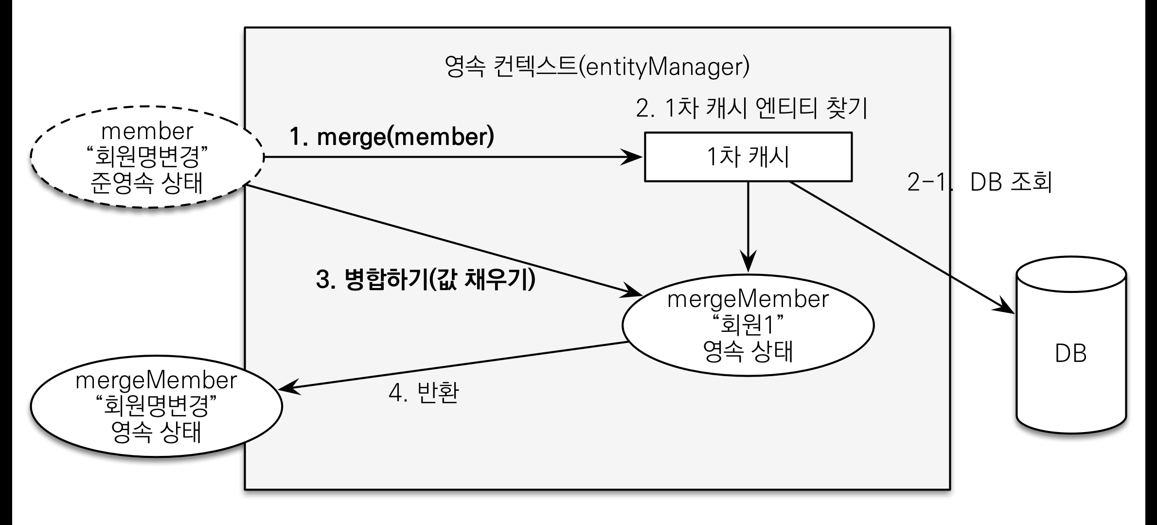 ์ด๋ฌํ ๊ฐ์ฒด๋ฅผ ๋ค์ ์์ ํ๋ ค๋ฉด ๋ณ๊ฒฝ ๊ฐ์ง(Dirty Checking) ๋๋ ๋ณํฉ(Merge) ๊ธฐ๋ฒ์ ์ฌ์ฉํด์ผ ํฉ๋๋ค.