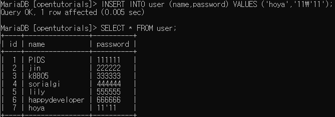๊ทธ๋ฌ๋ฏ๋ก opentutorials DataBase์ user์ด๋ผ๋ ์๋ก์ด table์ ์์ฑํด์ฃผ์ด์ผ ํ๋ค.