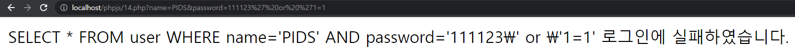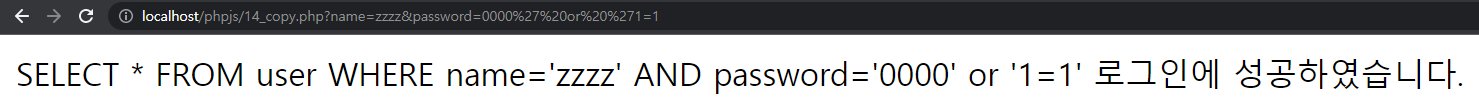 ํ์ง๋ง http://localhost/phpjs/14_copy.php? name=zzzz&password=0000' or '1=1์ด๋ผ๊ณ ์ฃผ์๋ฅผ ์ ๋ ฅํ๊ฒ ๋๋ค๋ฉด,