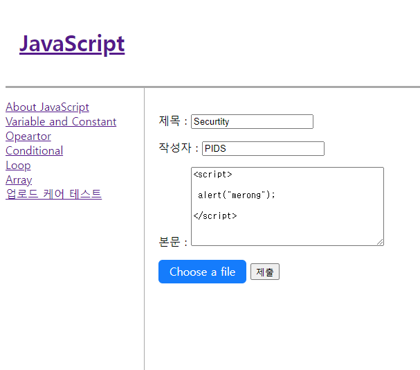 ๊ทธ๋ฆฌ๊ณ ์์ ๊ฐ์ด ๋ณธ๋ฌธ์ scriptํ๊ทธ ์ฌ์ด์ alert("merong");์ ์ ๊ณ ์ ์ถ์ ํ๊ฒ ๋๋ฉด,