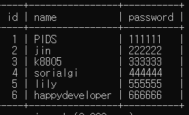 ๋ชจ๋ name๊ณผ password๊ฐ ์ฐธ์ด ๋๋ฉด์ ๋ชจ๋ table์ด ๋์ค๋ ๊ฒ์ด๋ค.