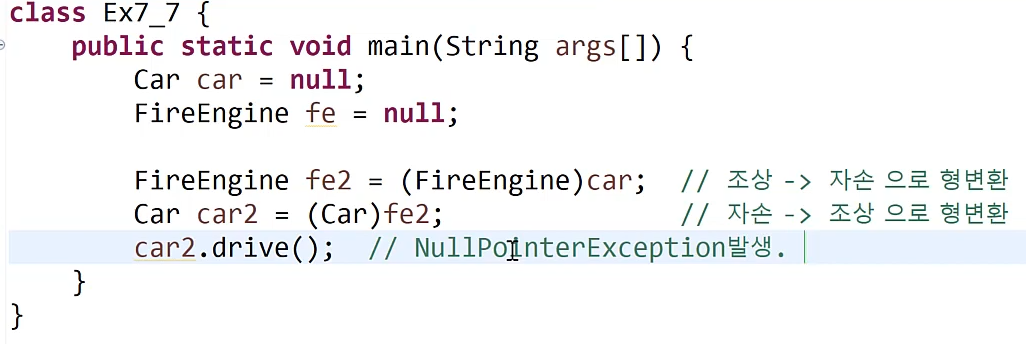 ๊ทธ๋ฆฌ๊ณ Null์ธ fe2๋ฅผ car2์ ๋ฃ๊ฒ ๋๋ Null.drive();๊ฐ ๋๊ฒ ๋๋ค.