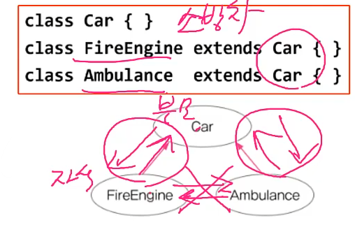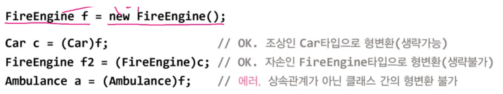 ํ๋ณํ์ ํด์ผ ํ๋ค. Car์ FireEngine์ ๋ถ๋ชจ ์์๊ด๊ณ์ด๊ธฐ ๋๋ฌธ์ ํ๋ณํ์ด ๊ฐ๋ฅํ๋ค.