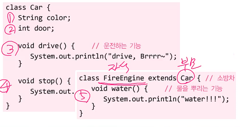 ์ ์ด๋ฏธ์ง์ ๊ฐ์ด Carํด๋์ค๊ฐ ์๊ณ , Carํด๋์ค๋ฅผ ์์๋ฐ์ FireEngineํด๋์ค๊ฐ ์์ ๋,