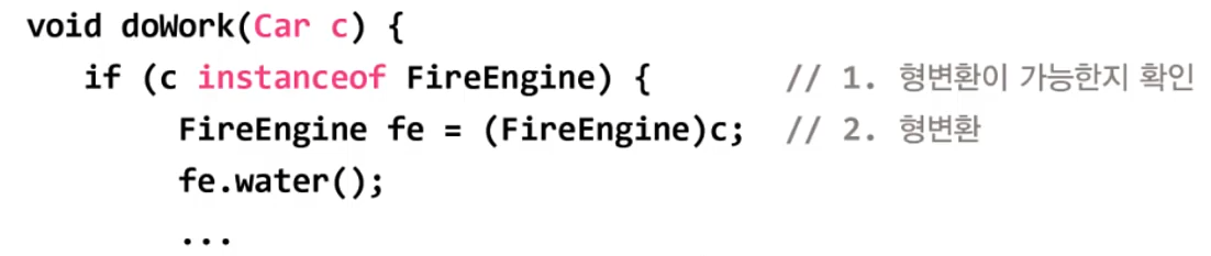 doWork(new FireEngine());์ Car c = new FireEngine(); doWork(c);์ ๋์ผํ๋ค.