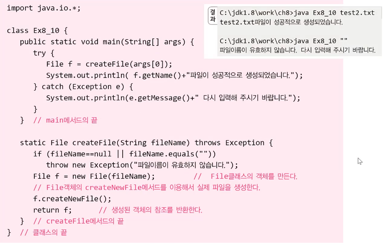 ์์ธ๋ฅผ ๋ฐ์์ํจ๋ค. createFile๋ฉ์๋๋ ์์ธ๋ฅผ ์ ์ธํ๊ธฐ ๋๋ฌธ์, ๋ฉ์๋๋ฅผ ํธ์ถํ main๋ฉ์๋๋ก ์์ธ๋ฅผ ๋๊ธฐ๊ฒ ๋๋ค.