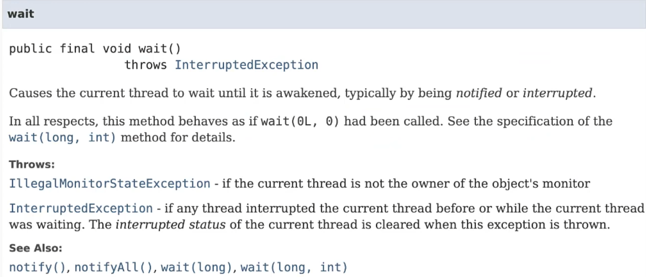 ์ ์ด๋ฏธ์ง๋ ์๋ฐ API๋ฌธ์์์ wait์ด๋ผ๋ ๋ฉ์๋๋ฅผ ์ฐพ์๋ณธ ๊ฒ์ด๋ค.