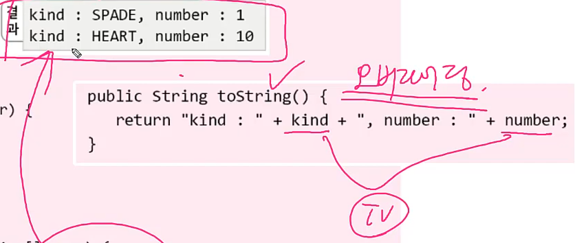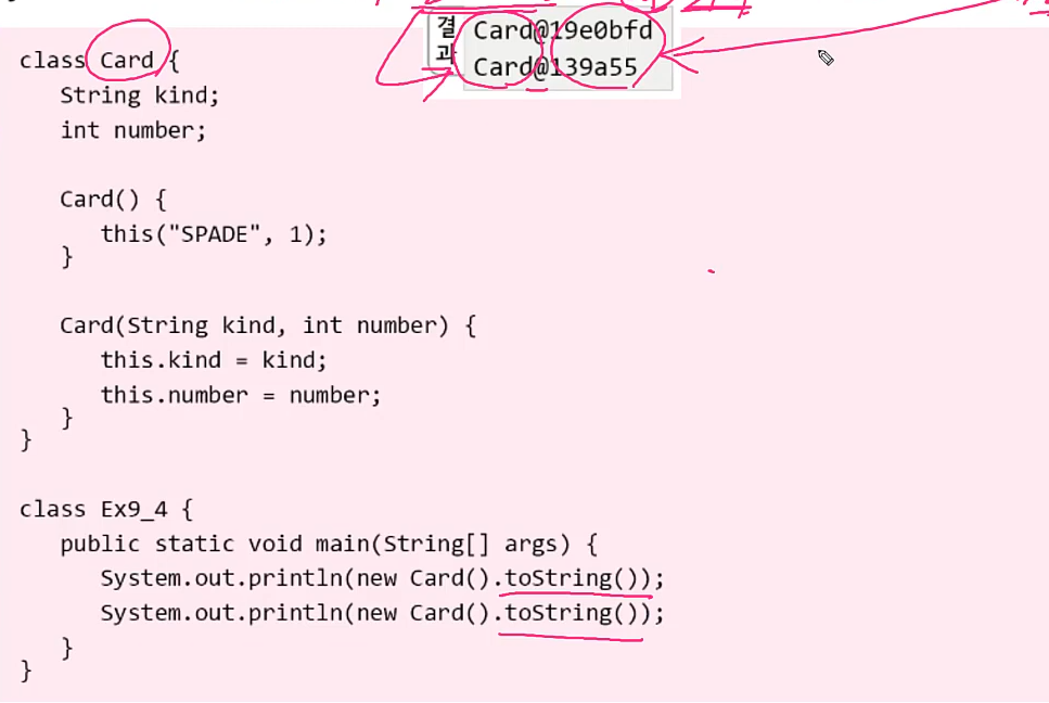 ์๋ฅผ ๋ค์ด Card๋ผ๋ ํด๋์ค๊ฐ ์๊ณ Card๋ฅผ toString()์ผ๋ก ์ถ๋ ฅํ๊ฒ ๋๋ฉด,