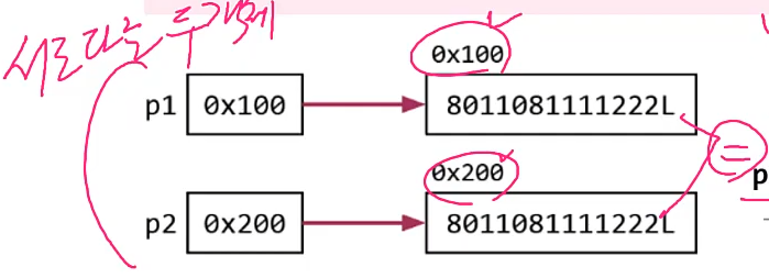 p1๊ณผ p2์ ์ฃผ์๋ฅผ ๋น๊ตํ๋ฉด ์๋ก ๋ค๋ฅธ ๋ ๊ฐ์ฒด์ด๊ธฐ ๋๋ฌธ์ false๊ฐ ์ถ๋ ฅ์ด ๋์ง๋ง,