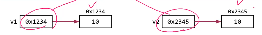 ๊ทธ๋ฆฌ๊ณ v1๊ณผ v2๋ผ๋ ๊ฐ์ฒด๋ฅผ ์์ฑํ๊ณ ๋ ๊ฐ์ฒด์๊ฒ ๊ฐ์ 10์ด๋ผ๋ ๊ฐ์ ๋ฃ์๋ค.