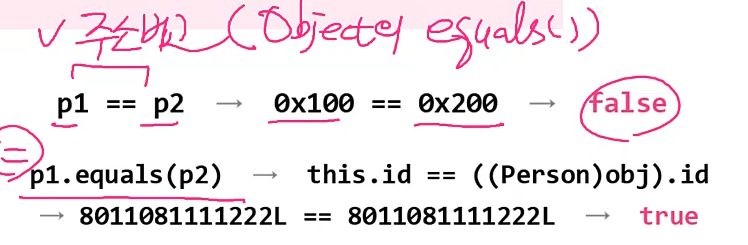 p1.equals(p2)๋ฅผ ํ๊ฒ ๋๋ฉด iv๊ฐ์ ๋น๊ตํ๊ธฐ ๋๋ฌธ์ true๊ฐ ์ถ๋ ฅ์ด ๋๋ค.