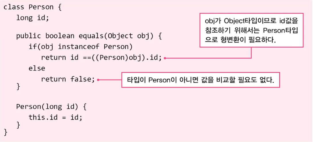 equals(Object obj)์ ์ค๋ฒ๋ผ์ด๋ฉ์ ์ธ์คํด์ค ๋ณ์(iv)์ ๊ฐ์ ๋น๊ตํ๋๋ก equals()๋ฅผ ์ค๋ฒ๋ผ์ด๋ฉํด์ผ ํ๋ค.