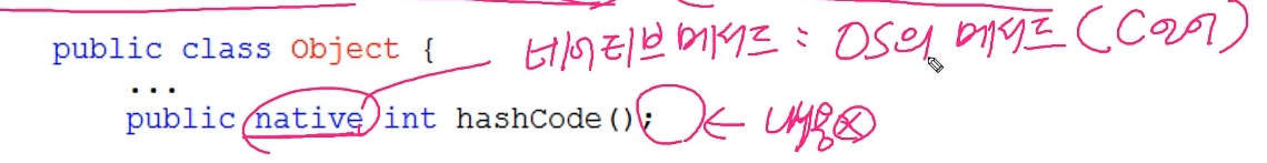Objectํด๋์ค์ hashCode๋ฅผ ํ์ธํด๋ณด๋ฉด native๋ผ๋ ๊ฒ์ด ๋ฌ๋ ค์๊ณ , ๋ฉ์๋์ ๋ด์ฉ ๋ํ ์กด์ฌํ์ง ์๋๋ค.
