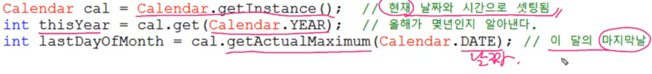 + today.getActualMaximum(Calendar.DATE) ); // ์ด ๋ฌ์ ๋ง์ง๋ง ์ผ์ ์ฐพ๋๋ค