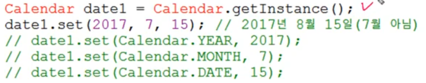 ๋ง์ฝ 2017๋ 8์ 15์ผ์ ์ง์ ํ๋ ค๊ณ ํ๋ค๋ฉด, date1.set(2017, 7, 15);๋ก ์ง์ ํ๋ฉด ๋๋ค.