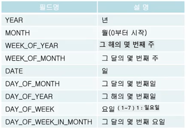 ์ด๋ ๊ฒ Calendar์ ์ ์๋ ๋ ์ง์ ๊ด๋ จ๋ ํ๋๋ ๋ค์๊ณผ ๊ฐ๋ค.
